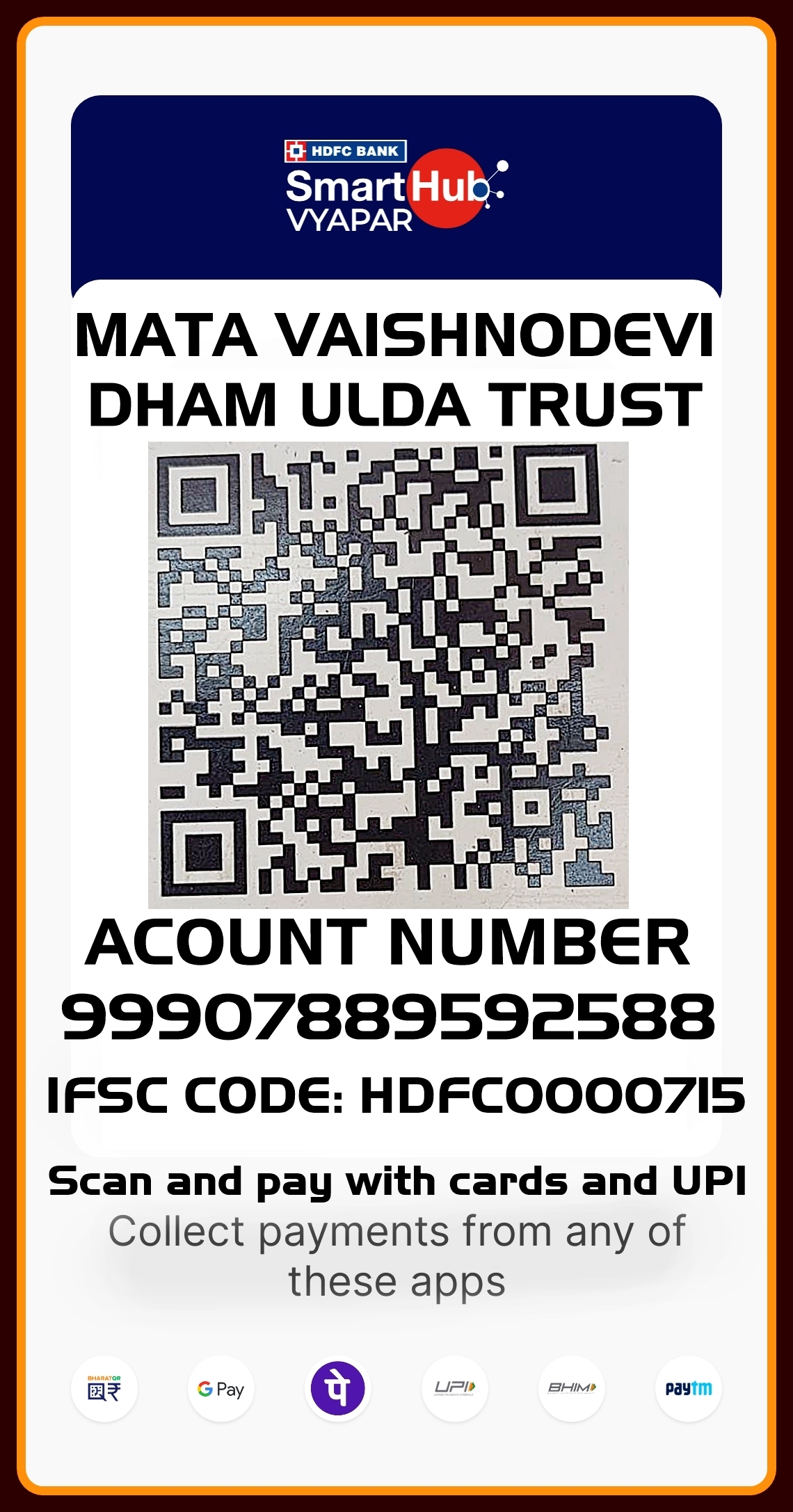 Mata Vaishnodevi Dham Trust accepts donation from devotees in various modes like Cash, Cheque, Demand Draft, Money Order, QR Code, Net Banking and In-kind.